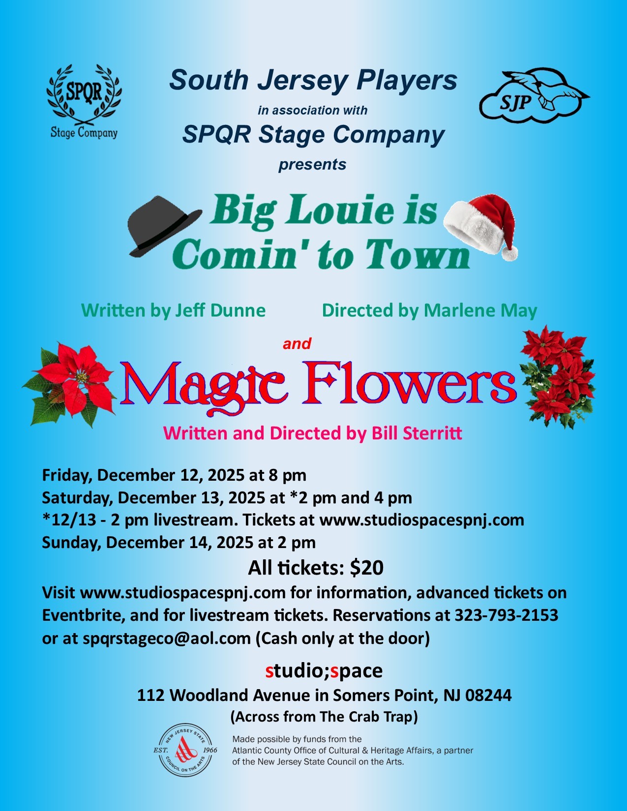 South Jersey Players is a 501(c)(3) nonprofit organization. Your donation is fully tax deductible. Make check payable to: South Jersey Players; Mail to: Marlene May 25 South Oakland Ave. BSMT Ventnor, NJ 08406
